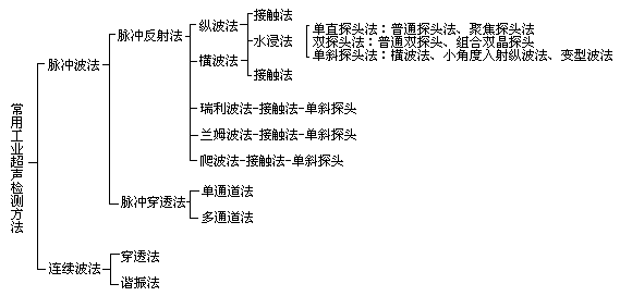 主要分為:單直平探頭法(含接觸法與液浸法)、單斜探頭法(接觸法用,包括 橫波、瑞利波、蘭姆波、爬波探頭)、單直聚焦探頭法(含接觸法與液浸法,點聚焦 與線聚焦)、單斜聚焦探頭法(接觸法用)、組合雙晶探頭法(含組合雙晶直探頭與 組合雙晶斜探頭)、雙斜探頭法、小角度單斜探頭法以及眾多的專用探頭檢測方法(例 如鐵軌專用探頭、小徑管焊縫探傷專用探頭,以及導波探頭、相控陣探頭)等等。